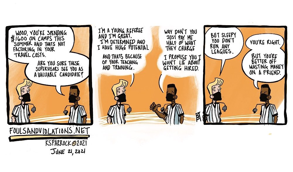 Kevin Sparrock is the artist and creator of Fouls and Violations, Life of a Referee Uncovered. He is a Brooklyn, New York native who has worked as a Graphic Designer and Illustrator for 30 years. He has officiated basketball for over 22 years. He has worked at the High School level, College Division 1 Men’s, College Division 1 Women’s, the NBA Developmental League, and the Woman’s National Basketball Association (WNBA). In 2008, he combined the blessings of two careers and created the first webcomic that chronicles the life of a sports official. Everything in the strip has happened or will happen in the future. Welcome to the referee life. Safe Traveling