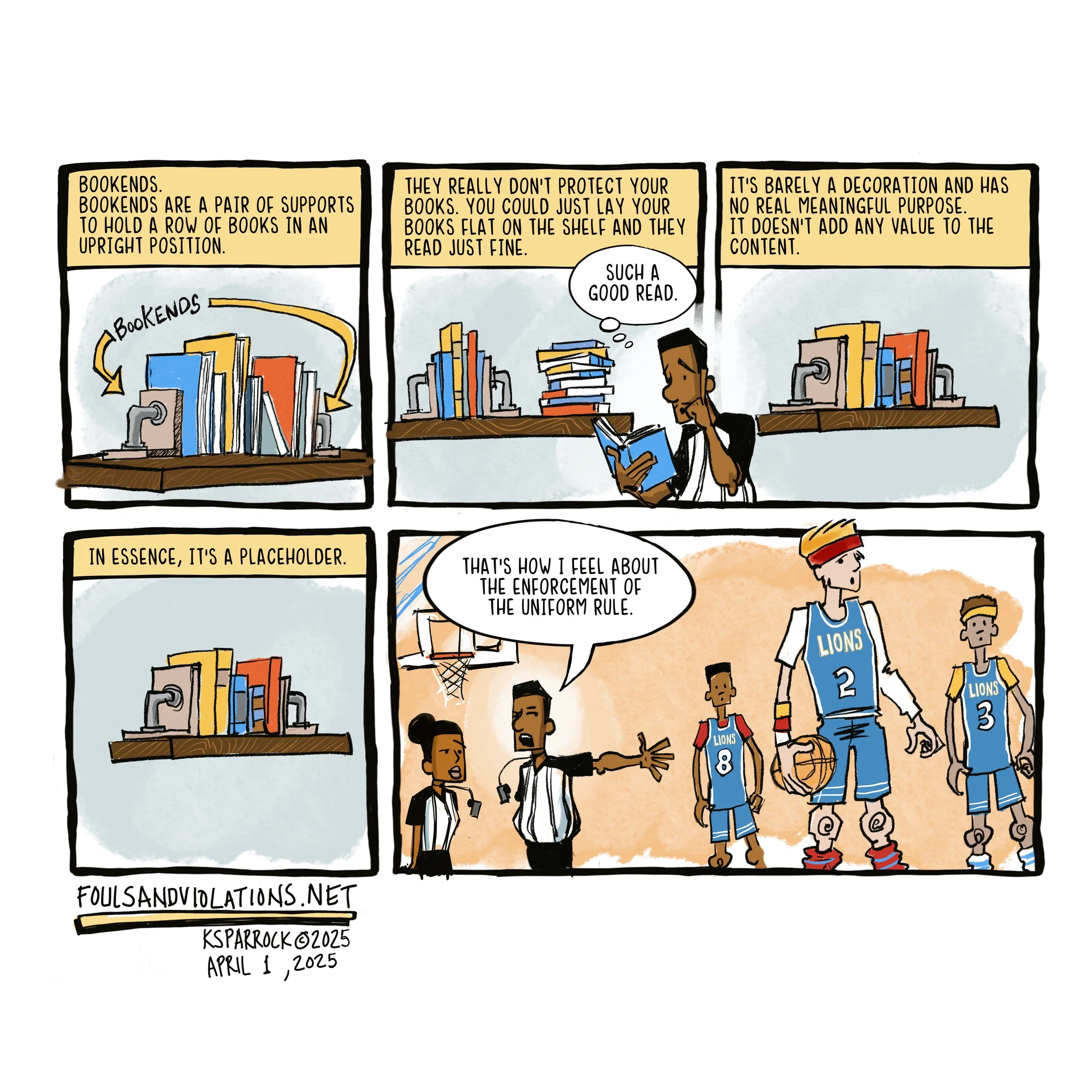 Basketball uniform rules are the ultimate “necessary evil” for referees—like enforcing a dress code at a party you weren’t invited to. Somehow, it falls on us to make sure a player’s jersey is tucked in, their undershirt is the right color, and their socks aren’t causing an existential crisis for the rulebook. Meanwhile, someone is out there committing a blatant travel, but no, heaven forbid we let a kid wear the wrong compression sleeves! It’s as if the game will collapse under the sheer weight of mismatched accessories. But hey, gotta keep the spirit of the game alive—one properly coordinated outfit at a time.
