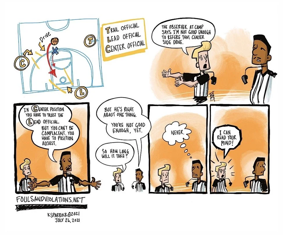 All Center side drives are NOT the same. A drive from the 3-point arc in the corner is different from a drive down the weak-side lane line or lane line closest to the Center official. The angles are different. On a drive down the lane line closets to the Center official, the Center official doesn't have a clear look at the defender. Once the ball-handler turns the corner at the free-throw line, you may be guessing if the defender creates contact or if the ball-handler is pushing off. The play opens up pretty well to the Lead official. Don't guess. Trust Lead on these types of drives to the basket. Also, don't be complacent. Position adjust if necessary. Find ways to help your crew.