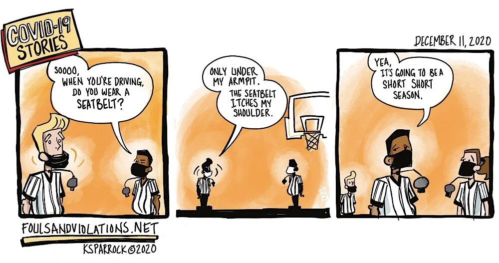 Kevin Sparrock is the artist and creator of Fouls and Violations, Life of a Referee Uncovered. He is a Brooklyn, New York native who has worked as a Graphic Designer and Illustrator for 30 years. He has officiated basketball for over 22 years. He has worked at the High School level, College Division 1 Men’s, College Division 1 Women’s, the NBA Developmental League, and the Woman’s National Basketball Association (WNBA). In 2008, he combined the blessings of two careers and created the first webcomic that chronicles the life of a sports official. Everything in the strip has happened or will happen in the future. Welcome to the referee life. Safe Traveling